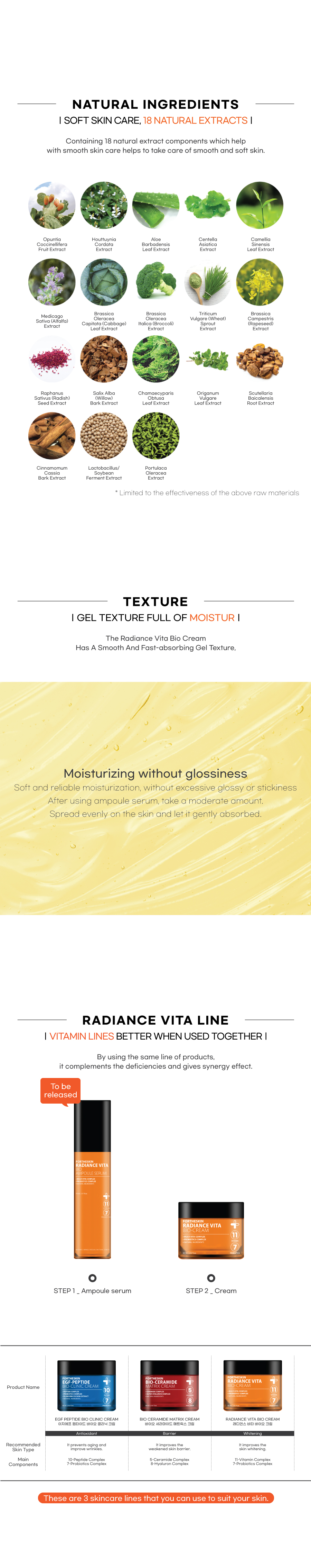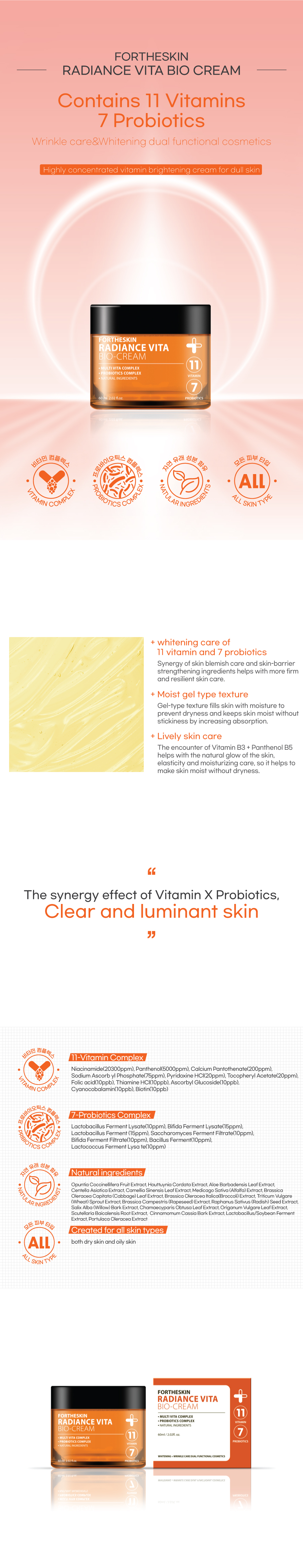 11-Vitamin complexes and 7-Probiotics components make your skin bright and lively, and 21 effective components found in nature control the oil and water balance inside skin, and nourish and moisturize your skin, making your skin healthy and beautiful.